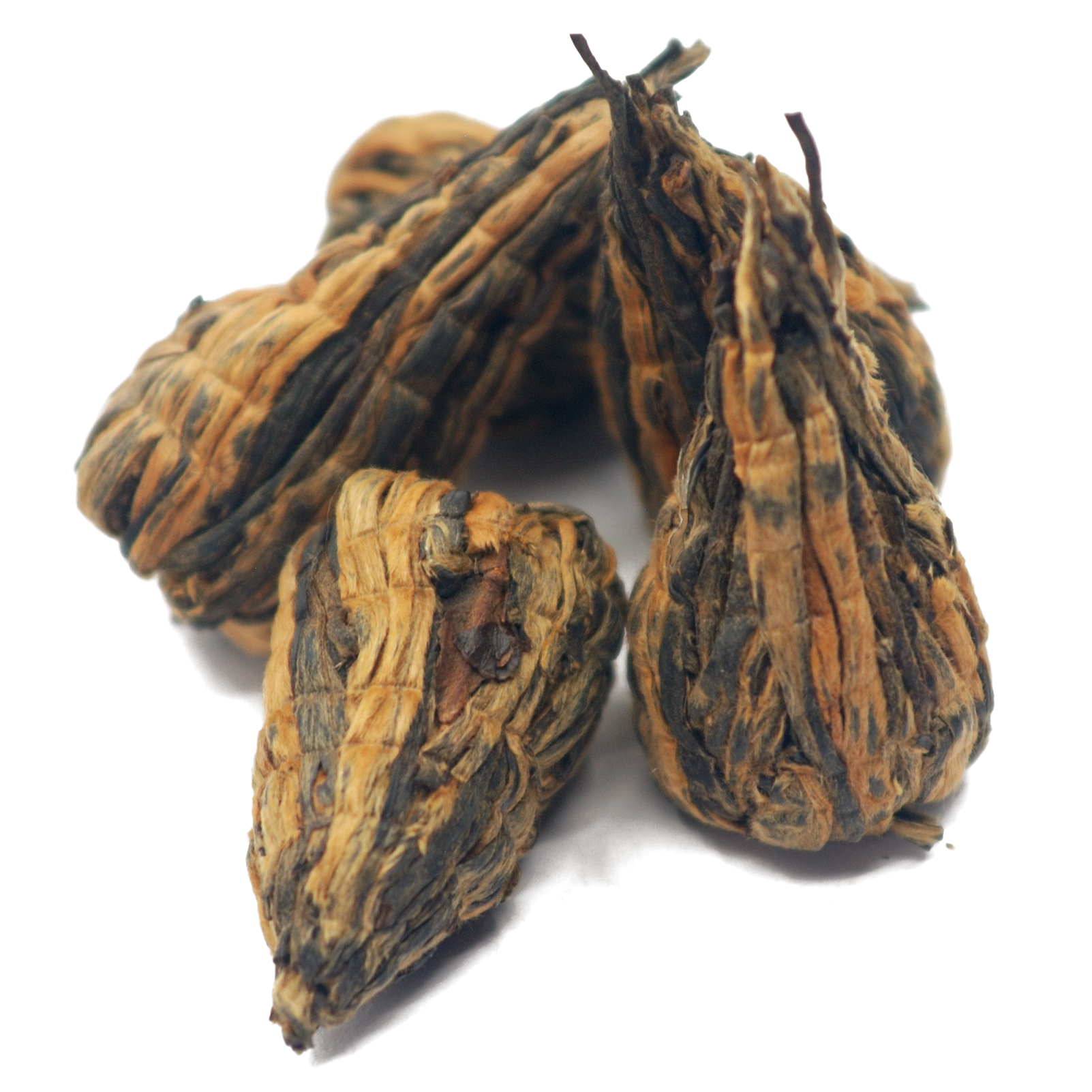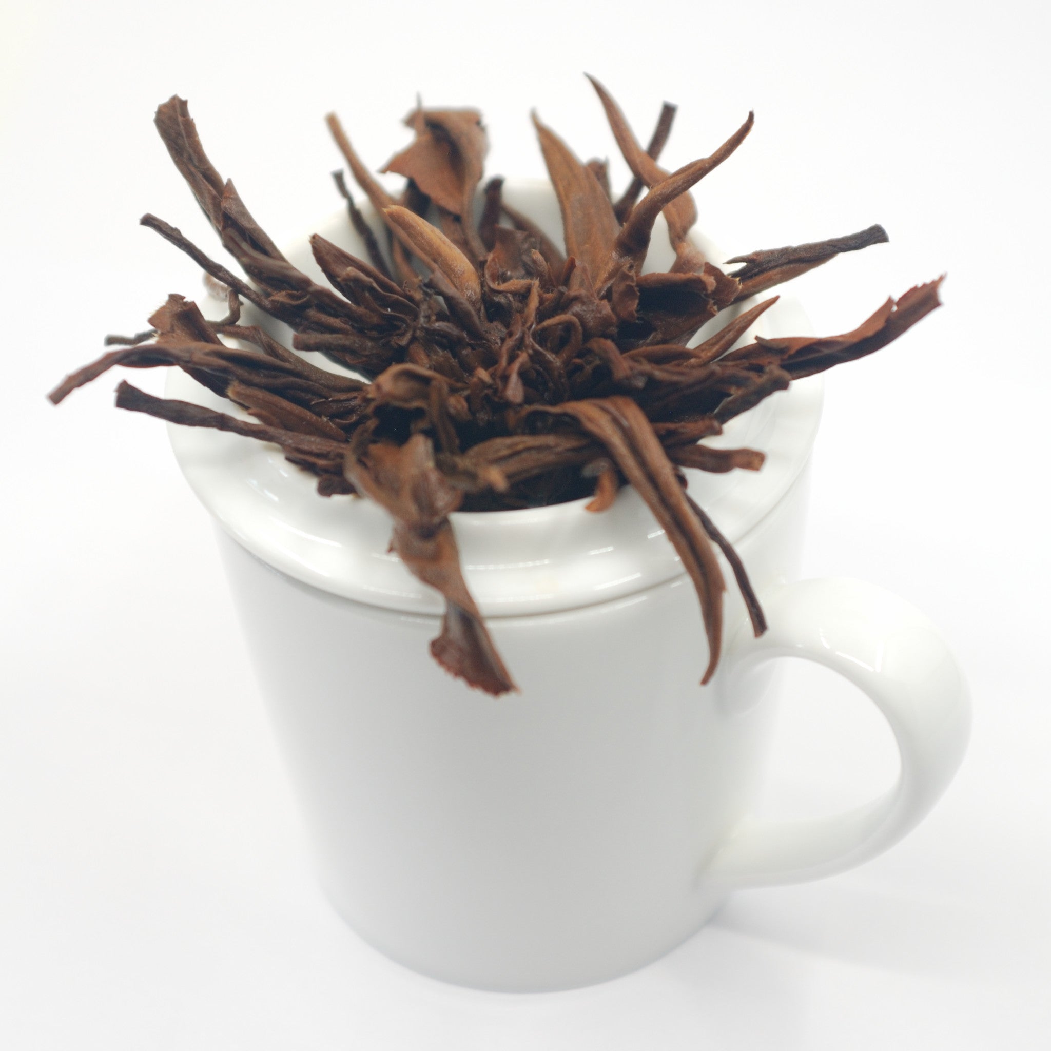Dieser Tee wird in Yunnan aus grossen Blättern in Handarbeit zu dekorativen Pagoden geformt, die sich in der Tasse entfalten. |